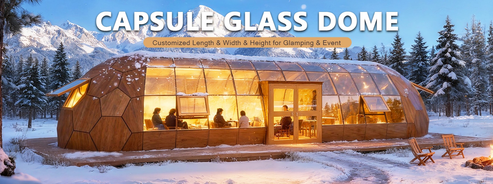 The capsule glass dome combines sleek design with comfort, perfect for glamping resorts. Customizable in size,100% Waterproof, insulated, it's ideal for luxury stays in any climate.